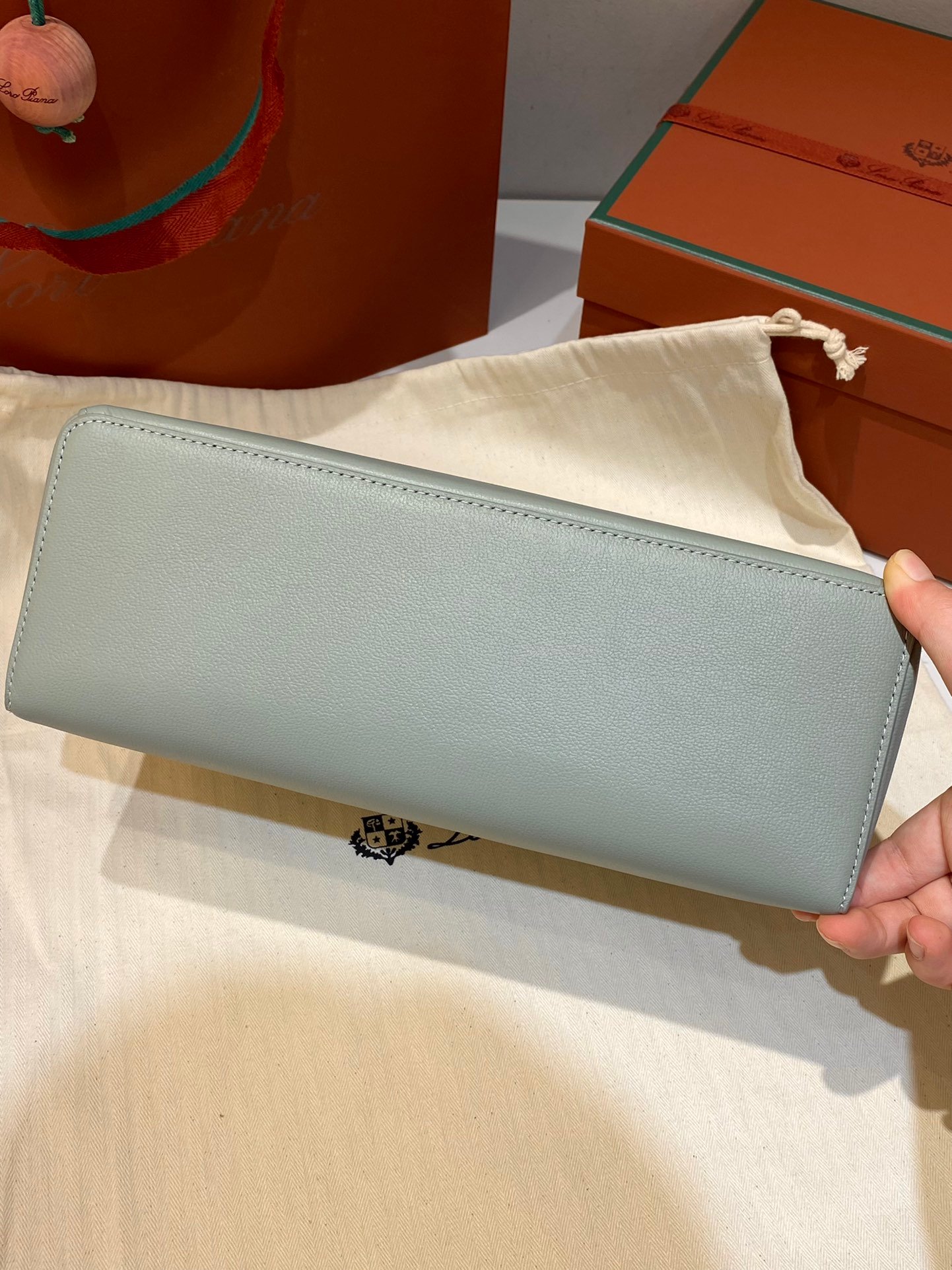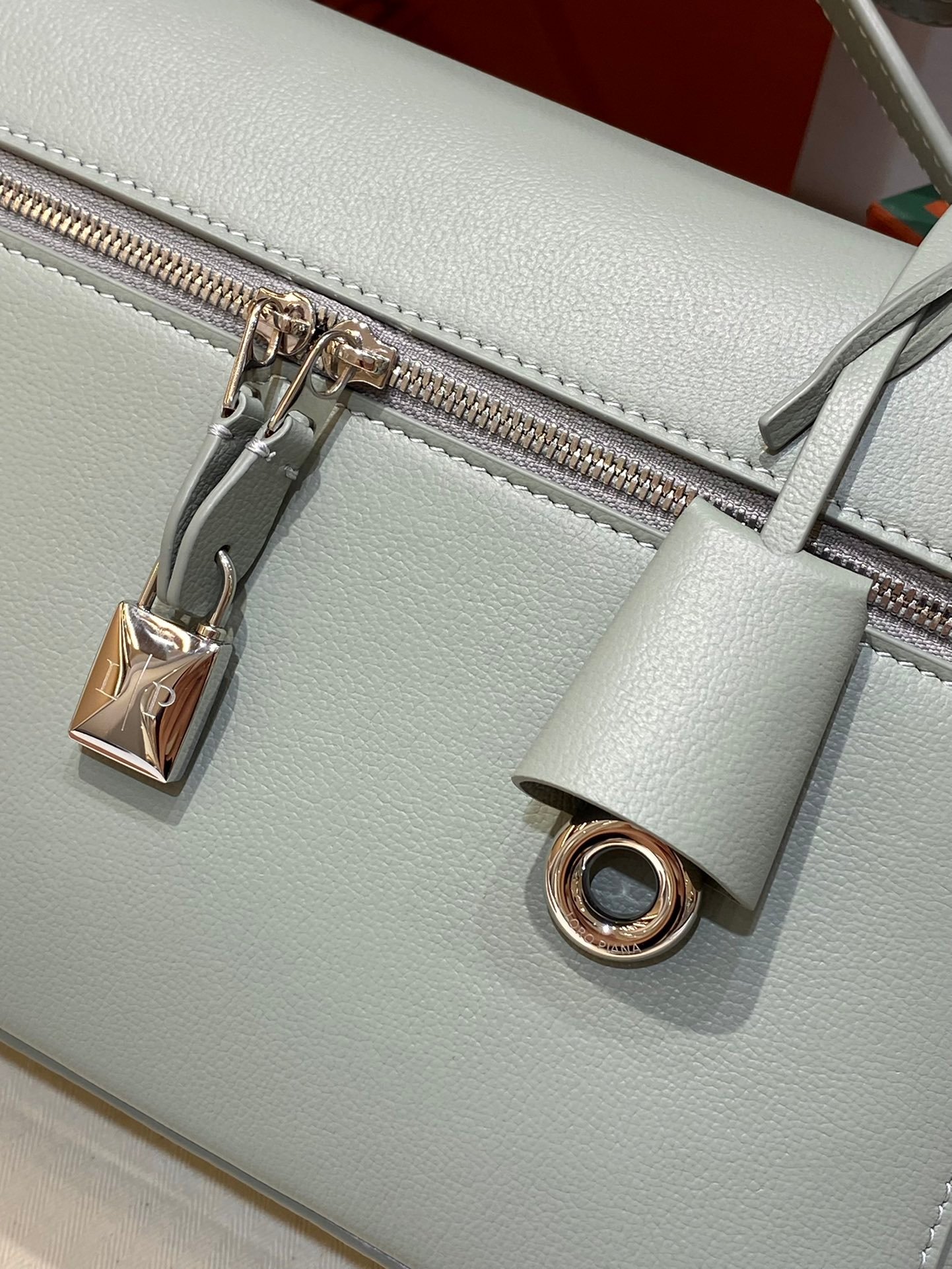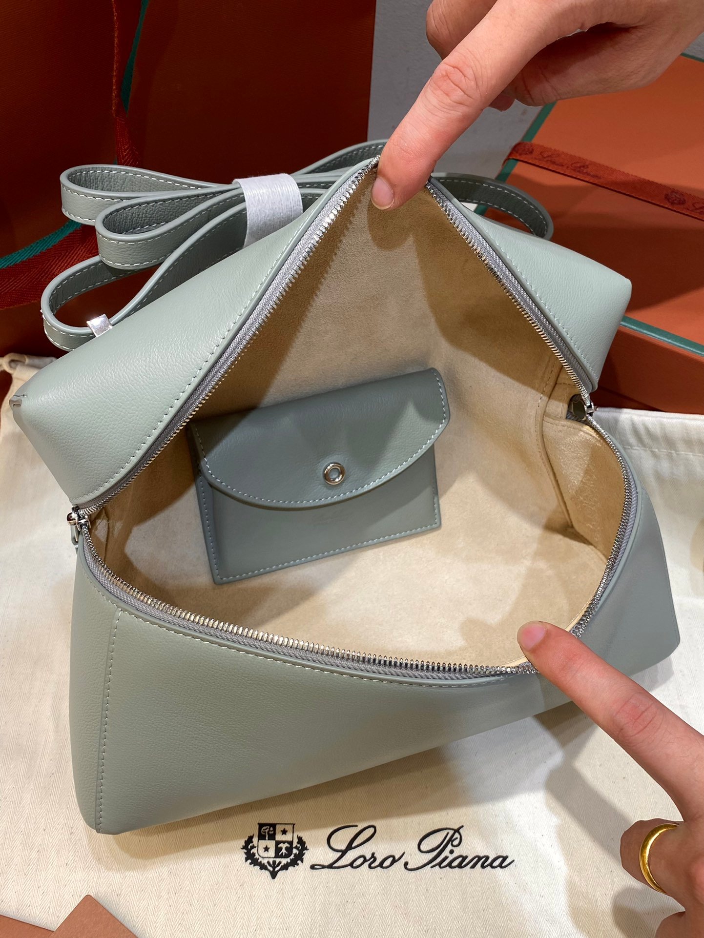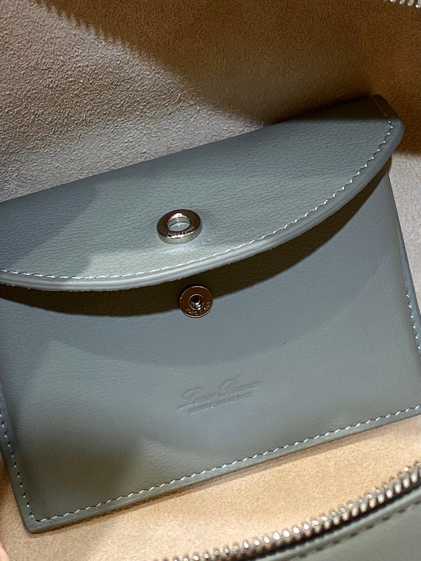 Leather pocket inside featuring the new signature press stud in the shape of Loro Piana ring, with laser engraved logo