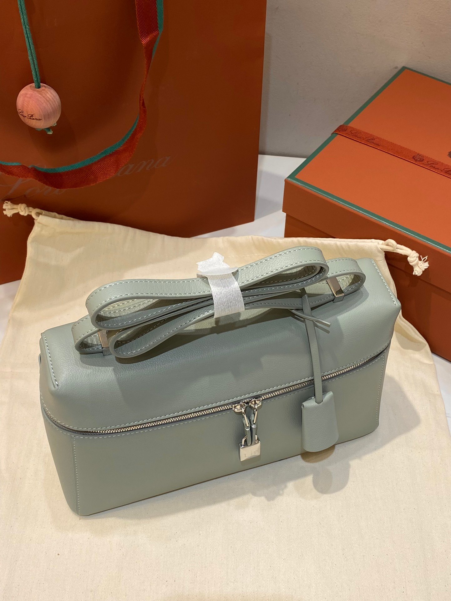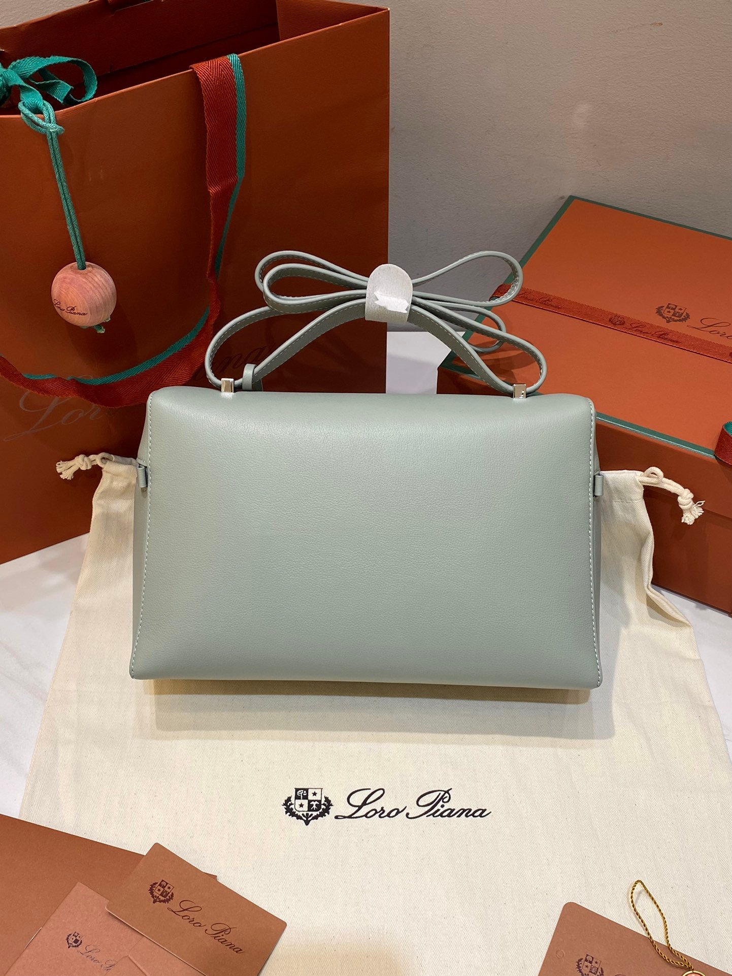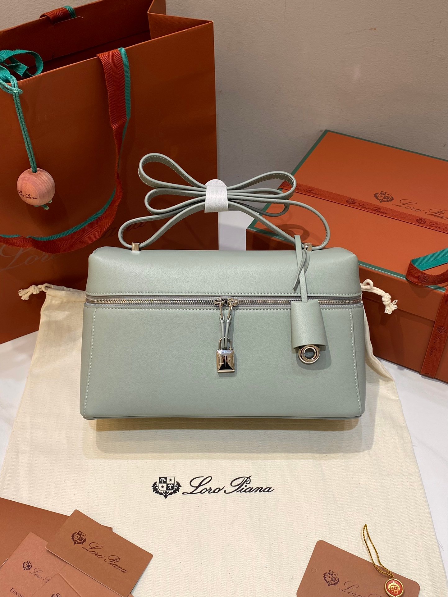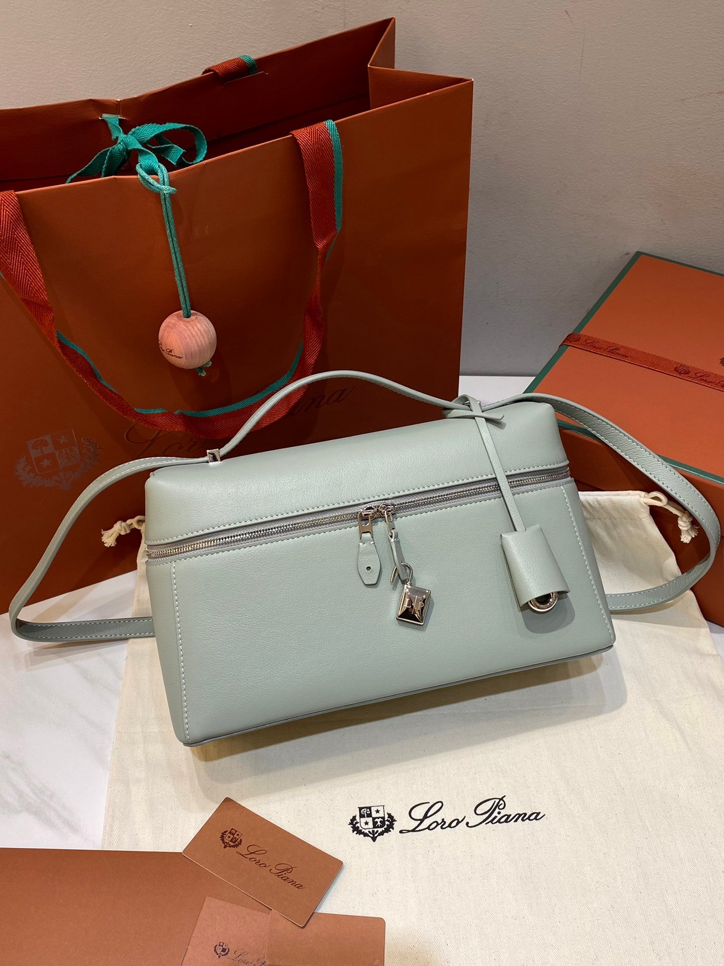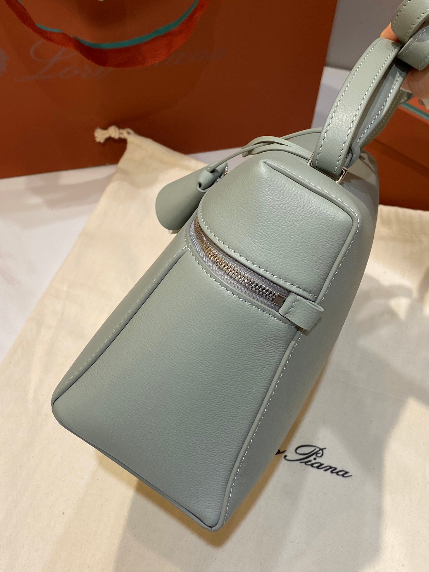 Leather pocket inside featuring the new signature press stud in the shape of Loro Piana ring, with laser engraved logo